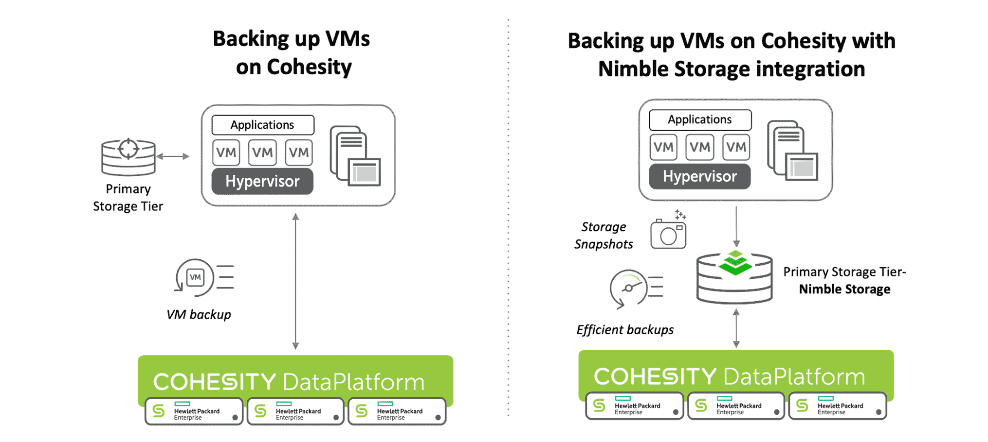 To further improve the process of backing up VMs, Cohesity and HPE have partnered to provide native integration of Cohesity DataPlatform software with HPE Nimble Storage for virtualized environments. With this integration, you can protect applications running on HPE Nimble Storage using array-based snapshots. This results in more efficient backup as well as enhanced application performance.