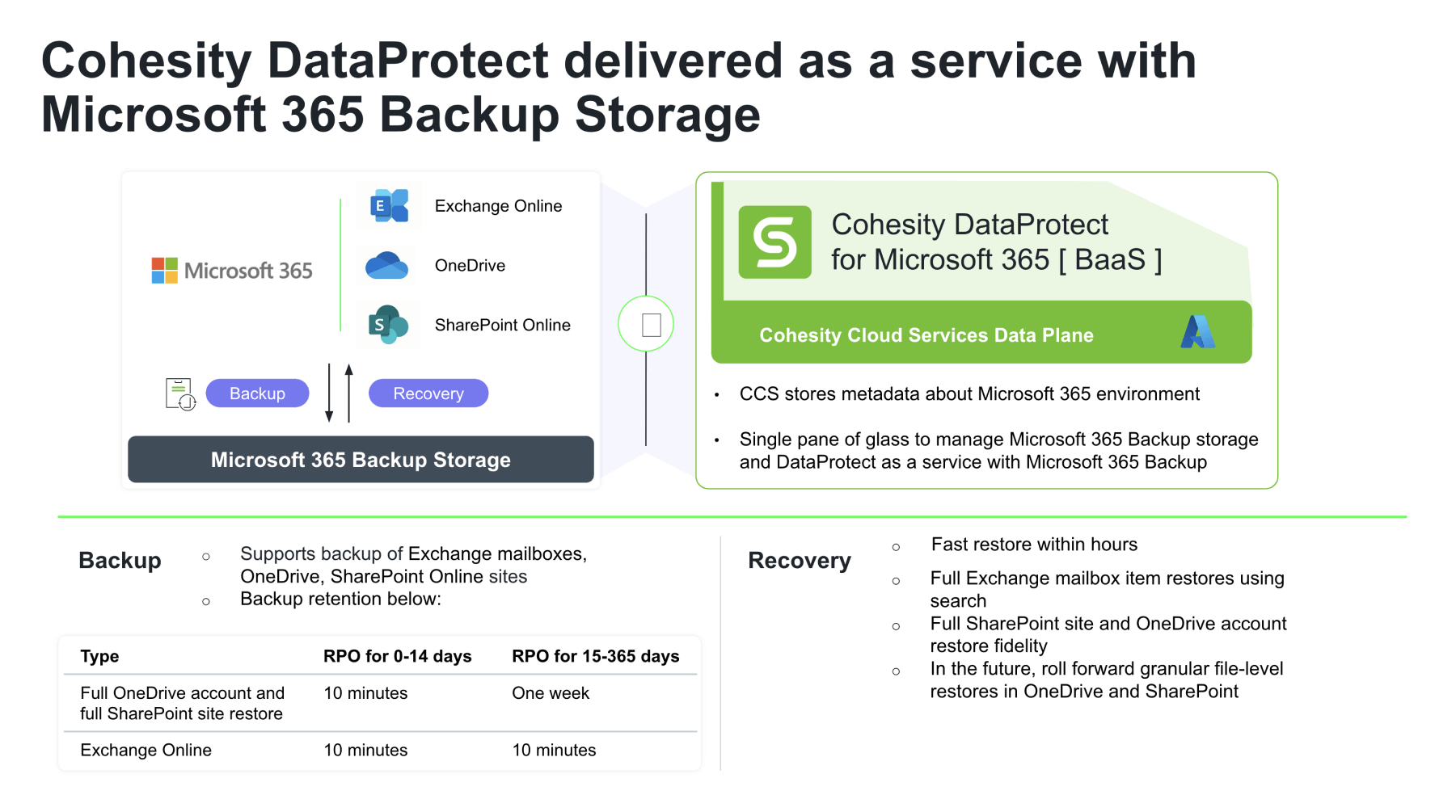In my experience, the higher the data protection level, the more likely you are to be able to restore it in the event of ransomware, malicious attack, or accidental deletion. Time to recovery can be critical to ensuring business uptime and revenue generation. Here is a summary of the benefits of using Cohesity DataProtect delivered as a Service with Microsoft 365 Backup Storage.