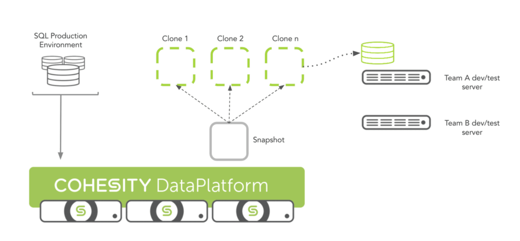 Cohesity allows enterprises to repurpose backup data as test data. This means you can back up one of your Microsoft SQL Server or Oracle databases, instantly make a clone of it without consuming extra storage, and use that clone to help develop your applications. With Cohesity, all of this can take place on a single platform. With one platform, you don’t need separate infrastructure for test data management—and the management overhead that comes with it. This immediate benefit is coupled with other advantages derived from a unique approach to a data management platform. One of the distinct advantages: zero-cost clones.