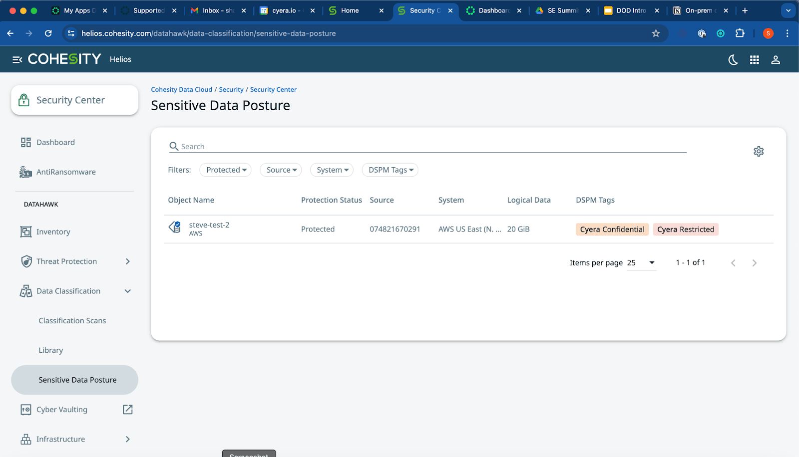 And here’s what the integration looks like in practice via the Cohesity Security Center. Note the updated DSPM tags and the protection status of each resource: