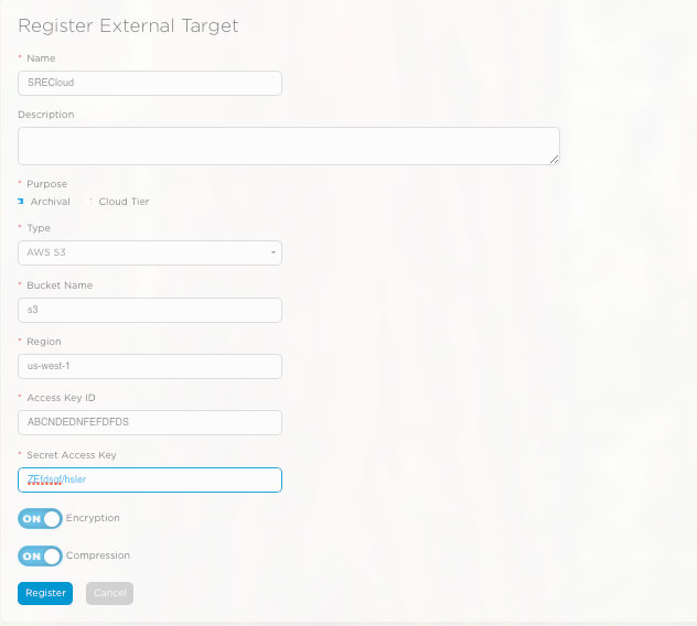 1: Register the external Target ie., SRECloud (with Encryption and Compression Enabled)