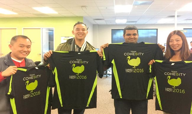 Cohesity recognizes that we are more than just a business; we are part of a community. As part of the #CohesityCares program and in the spirit of giving back this holiday season, Cohesity was proud to sponsor a company team who participated in the 2016 Silicon Valley Turkey Trot.