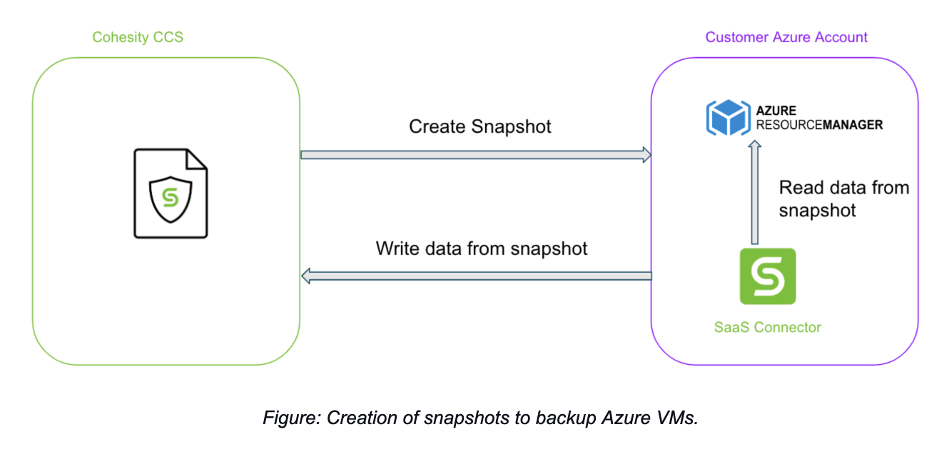 An Inside Look: How backup and recovery for Azure VMs works with Cohesity Cloud Services Cohesity Cloud Services in Azure lists all the VMs that need to be backed up and takes a snapshot by issuing a request to the Azure Resource Manager. Cohesity Cloud Services in Azure uses stateless VMs called SaaS connectors that act as data movers between the customers’ environments and Cohesity Cloud Services for backup and recovery workflows. Backup data can be recovered to the same or an alternate location. From there, administrators can select multiple configuration options like the target Azure resource group, and storage account which provides control over the attributes of the recovered Azure VM.