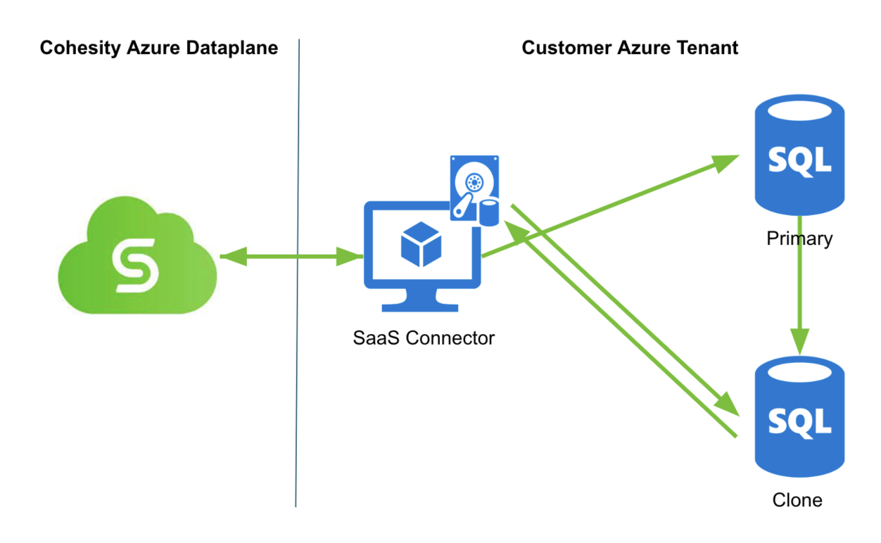An Inside Look: How Backup and recovery for Azure SQL works with Cohesity Cloud Services Cohesity’s Azure SQL and Azure SQL MI (Managed Instance) data protection that runs on Cohesity Cloud Services on the Microsoft Azure Platform features flexible backup policies. Once a policy is selected and the backup begins, Cohesity clones the production database (“Primary”) to a new instance (“Clone”) to ensure a transactionally consistent source copy. Once cloning has completed, Cohesity will export the database in its entirety, and securely send the backup data to CCS on Microsoft Azure. All data transferred between the Customer Azure tenant and CCS is deduplicated, compressed, and transmitted fully encrypted. Once the backup process is completed, Cohesity removes the clone of the database.