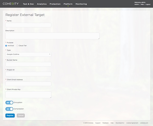 Google Cloud Storage Coldline is now available as an External storage Target on Cohesity DataPlatform. It is possible to register multiple external cloud targets with Cohesity DataPlatform. It is also recommended to turn on encryption in Cohesity and compression for data sent to the cloud. Upon registering Coldline as an External target, add or update an existing data protection policy on Cohesity to enable archival of a Data Protection Job with the desired retention period (typically multiple years) and RPO (Recovery point objective). The screenshot below shows the integration of Google Cloud Storage Coldline with Cohesity DataPlatform.