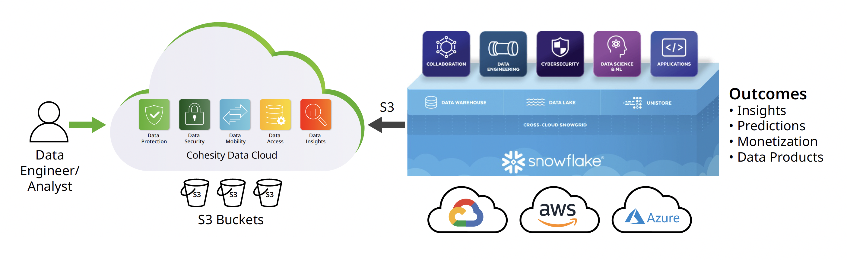 This joint solution provides the flexibility to maintain data on-prem with Cohesity SmartFiles or in the cloud while leveraging Snowflake’s powerful analytics capabilities. This is the best of both worlds—unifying siloed data and giving you the freedom of choice to manage and analyze your data wherever it resides while adhering to stringent internal policies.