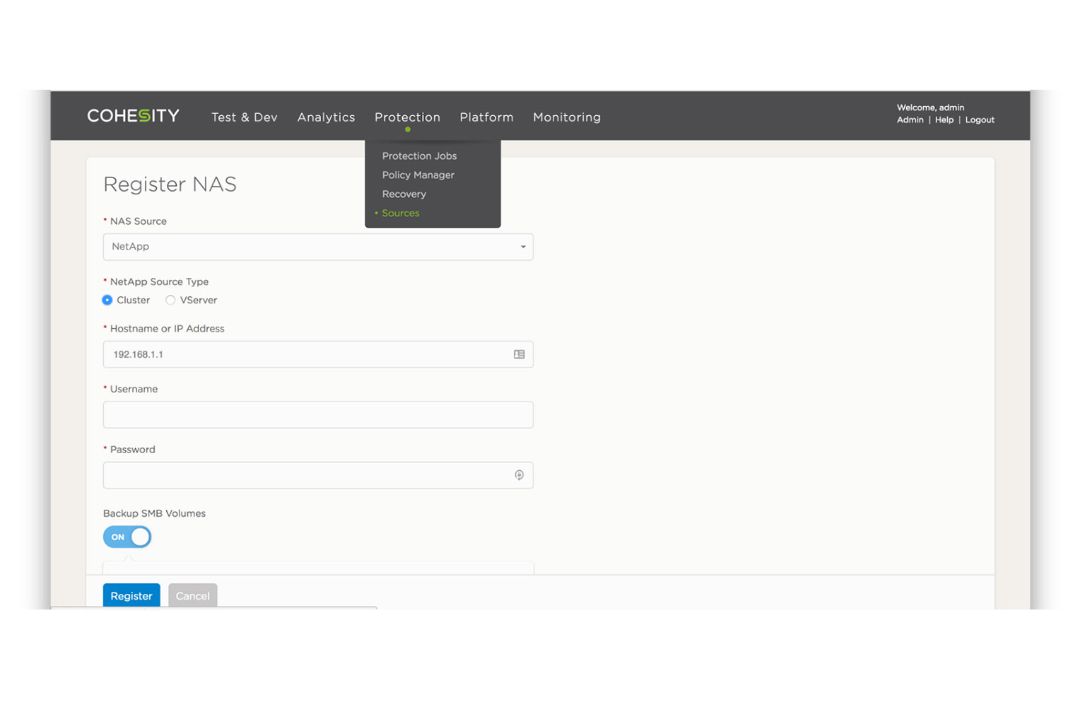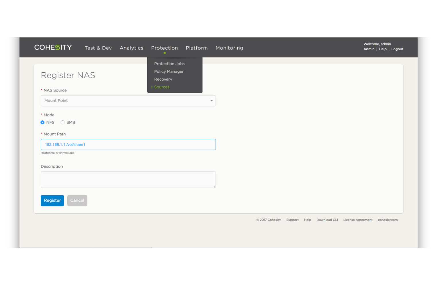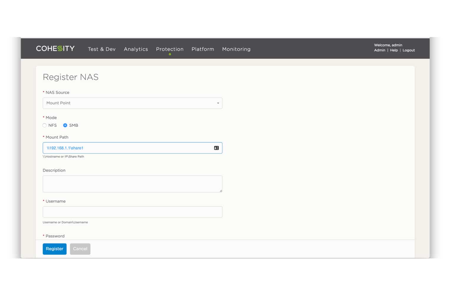 The NAS Data Protection software is integrated into Cohesity’s simple UI as another data source type and uses the same policy-driven data protection engine throughout the platform. Here is a screenshot of the source registration page to register a generic NAS share share that utilizes NFS: