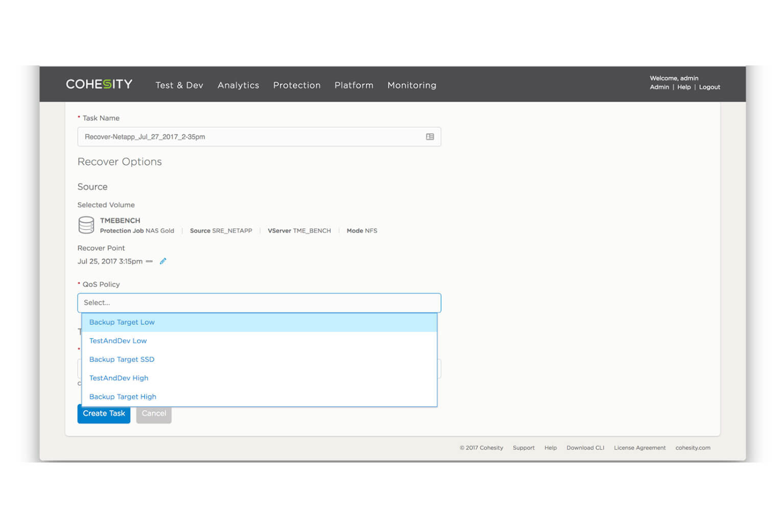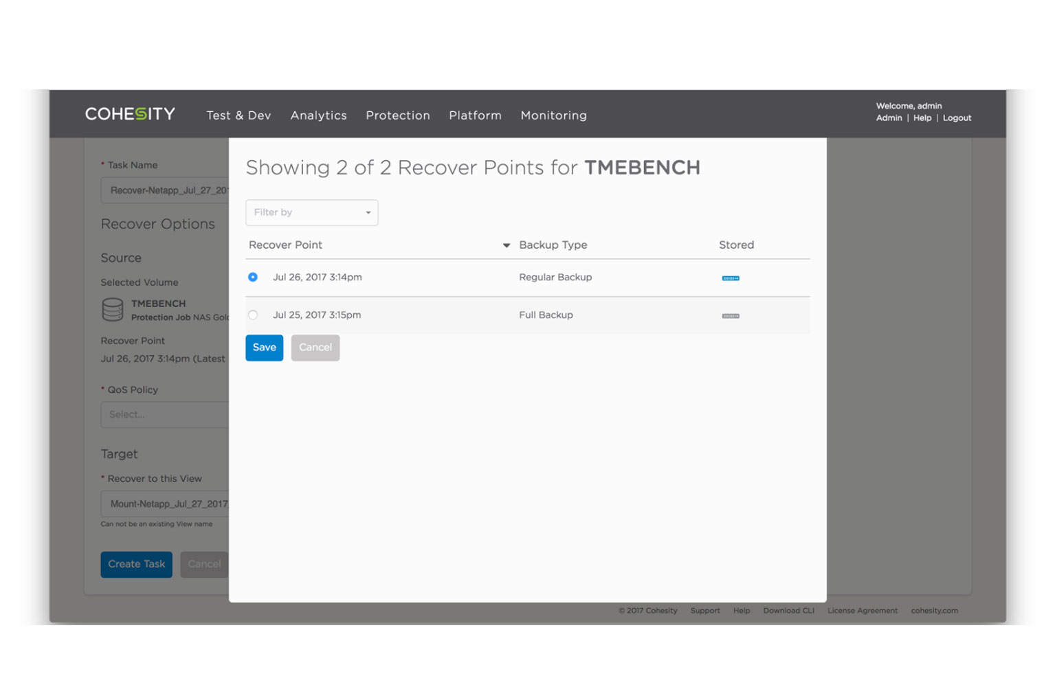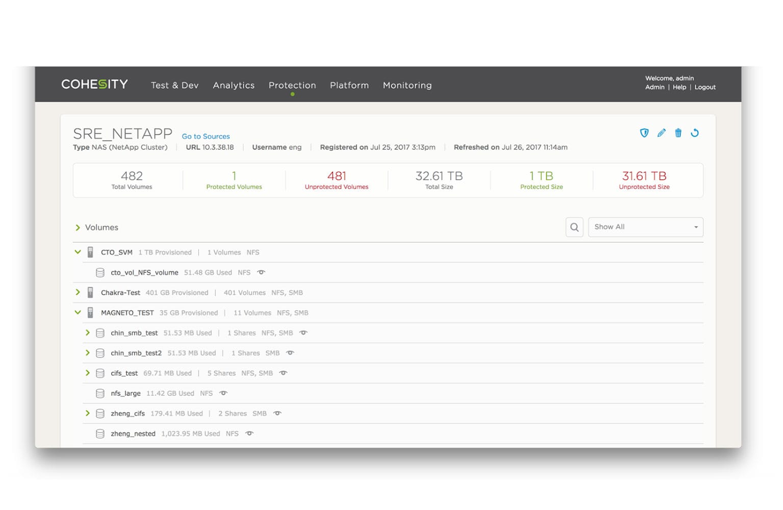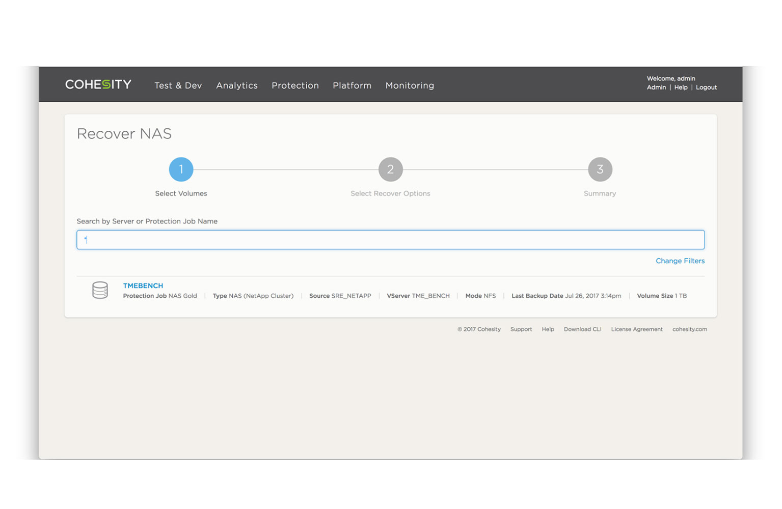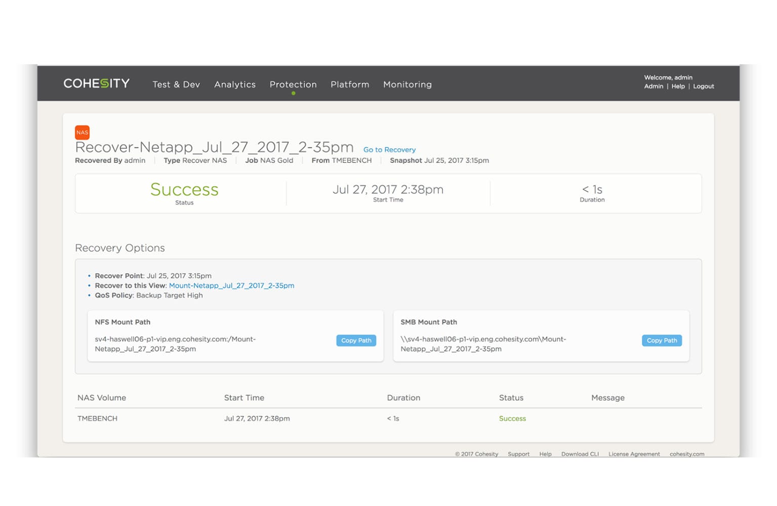 Perhaps the most impressive feature of Cohesity’s NAS data protection is the ability to instantly restore and mount NAS volumes for full volume or single file recovery.