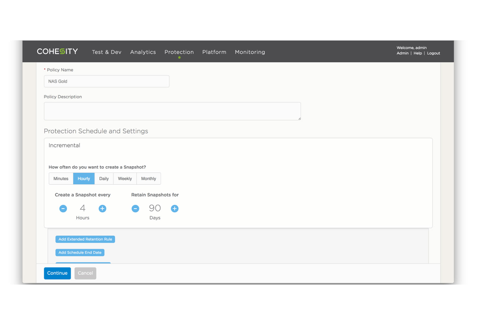 From there, the standard Cohesity workflows can be used to create and define data protection policies and assign them to specific volumes that set backup frequency, retention and replication attributes: