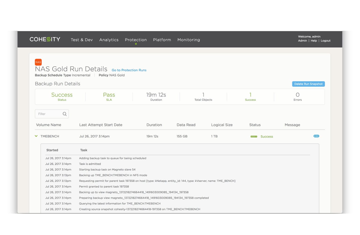 This is where the Cohesity’s storage efficient, incremental-forever NAS data protection strategy can be seen: The first backup of the volume noted that 1TB of storage had been provisioned however only 155GB of data had to be read to backup the volume. After the first backup, only the changed files will be discovered, transferred and stored as a new snapshot in the Cohesity cluster. This efficiency is further enhanced by global deduplication across all nodes and compression.