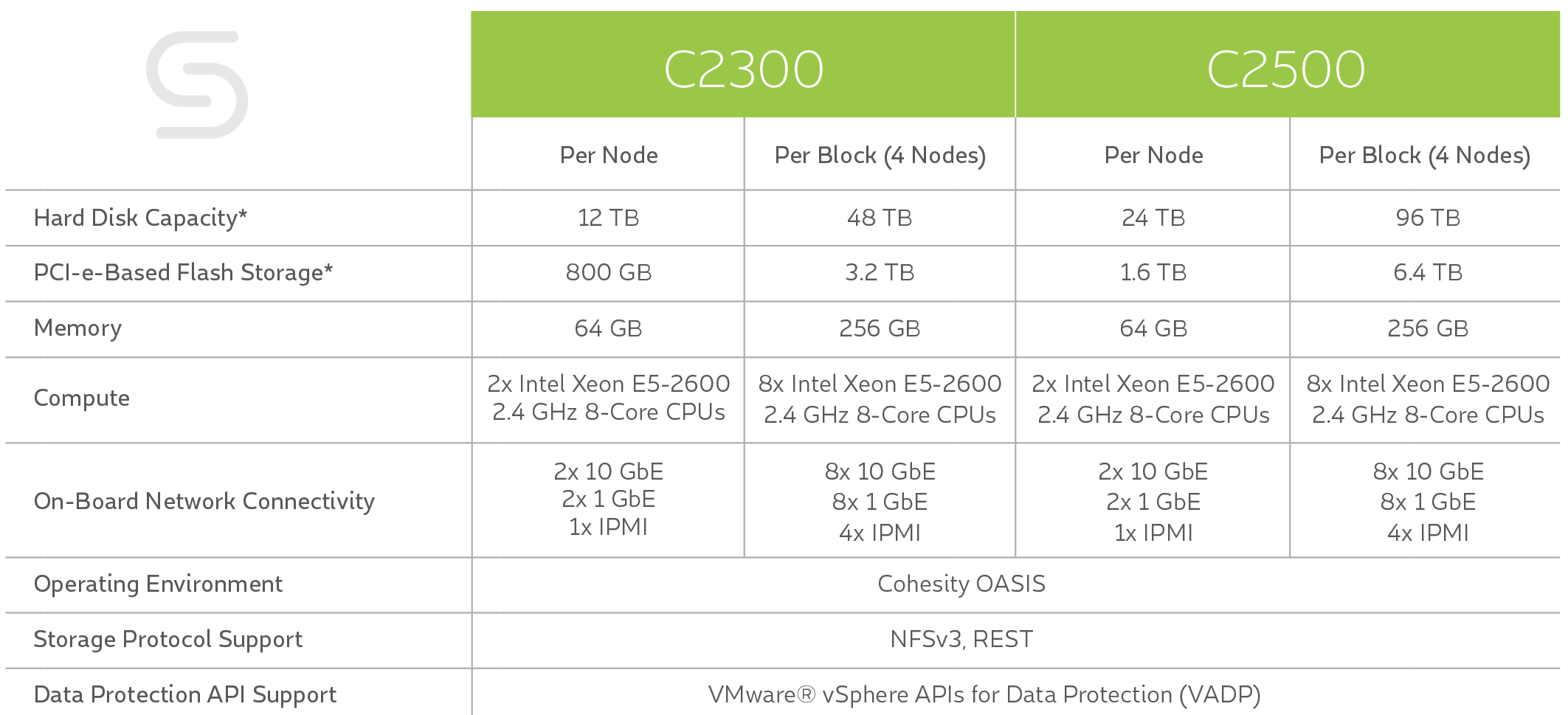 While each node also contains both hard drives and PCIe flash, this is where the C2300 and C2500 differ. In 4-node configurations, the C2500 contains 96TB (raw) of 8TB hard drives and 6.4TB of PCIe Flash. The C2300 contains 48TB (raw) of 4TB hard drives and 1.6TB PCIe Flash.