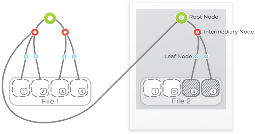 Cohesity takes a different approach with it’s patented SnapTree™ technology which create a tree of pointers that limits the number of hops it takes to retrieve blocks of data, regardless of the number of snapshots that have been taken. The figure below shows how data is accessed using SnapTree.