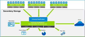 Even worse, secondary storage is incredibly inefficient from a management standpoint. For example, data protection in vSphere environments is still mostly a manual process. Backup admins will set fixed backup jobs with fixed service levels (typically a weekly full backup with a daily incremental), and applications just have to live within that service level. Then the backup data is sent to a dedupe appliance where it sits mostly unproductive until a recovery event happens.