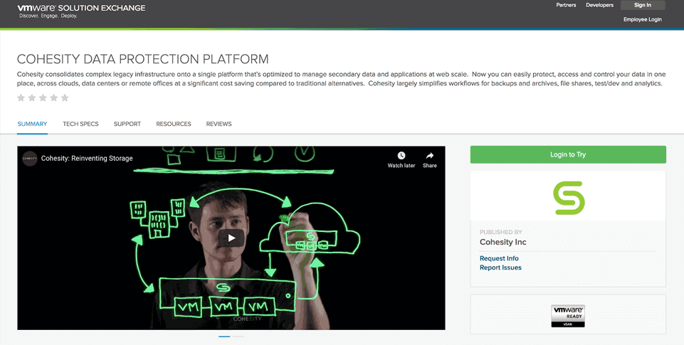 In addition, Cohesity solutions for data protection and file services are now showcased on both the VMware Compatibility Guide (VCG) and the VMware Solution Exchange (VSX).