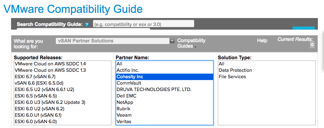 VMware customers can simply browse these portals for solutions that meet their data protection and file services needs, and select Cohesity with confidence that their implementations will be seamless. They can also select Cohesity knowing that our certifications were based on the proven Cohesity DataPlatform and Cohesity DataProtect, and that they are interoperable with the qualified VMware ESXi/vSAN software release.