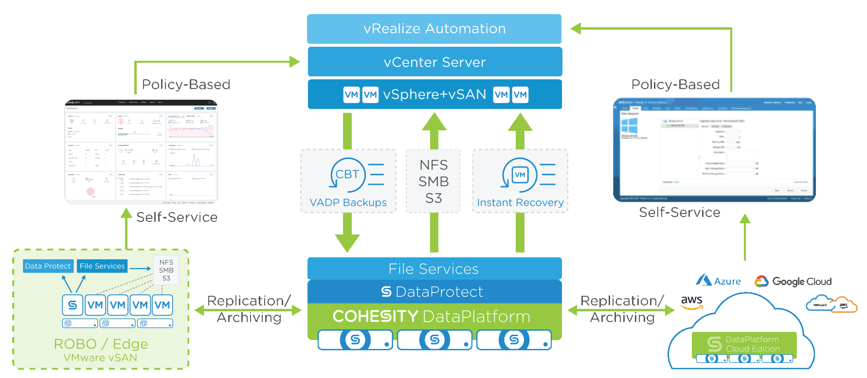 Tightly integrated with VMware vSphere, VMware vCenter Server, VMware Cloud Foundation, VMware vRealize Suite, and VMware vCloud Director, Cohesity for secondary data and apps complements VMware vSAN for primary software-defined storage. Cohesity also supports backup and recovery and file services for VMware Workspace ONE virtual desktops.