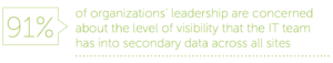 In the age of heightened privacy concerns, compliance is top of mind as organizations wrestle with fragmented data. Over 90% of respondents said their organizations are concerned about the level of visibility the IT team has into secondary data across all sites – especially with governance policies like General Data Protection Regulation (GDPR). Non-compliance can be very expensive due to penalties, and it can jeopardize a company’s reputation.