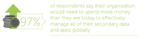 We previously discussed a key takeaway from our global market study of IT professionals: Secondary data is spiraling out of control. Respondents said secondary data continues to explode (nearly 70% expect it to increase up to 100% within a year); data fragmentation across and within silos is making management much harder (more than a third use 6 or more solutions to manage it all, but that’s not even scratching the surface); and they need more IT resources (97% will spend more money to effectively manage all of their secondary data and apps).