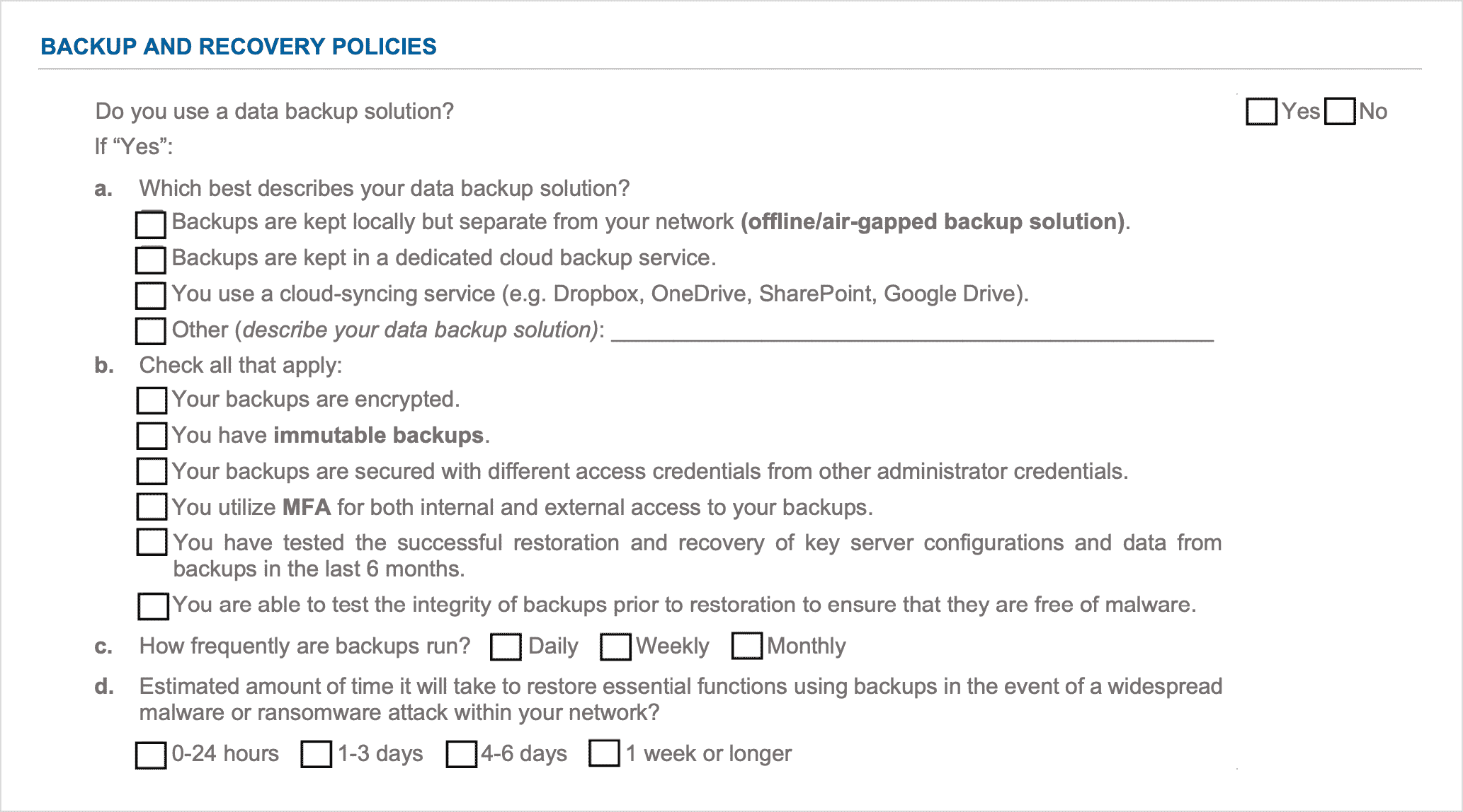 Let’s take a look at some requirements found on a cyber insurance application under the backup and recovery policies section: