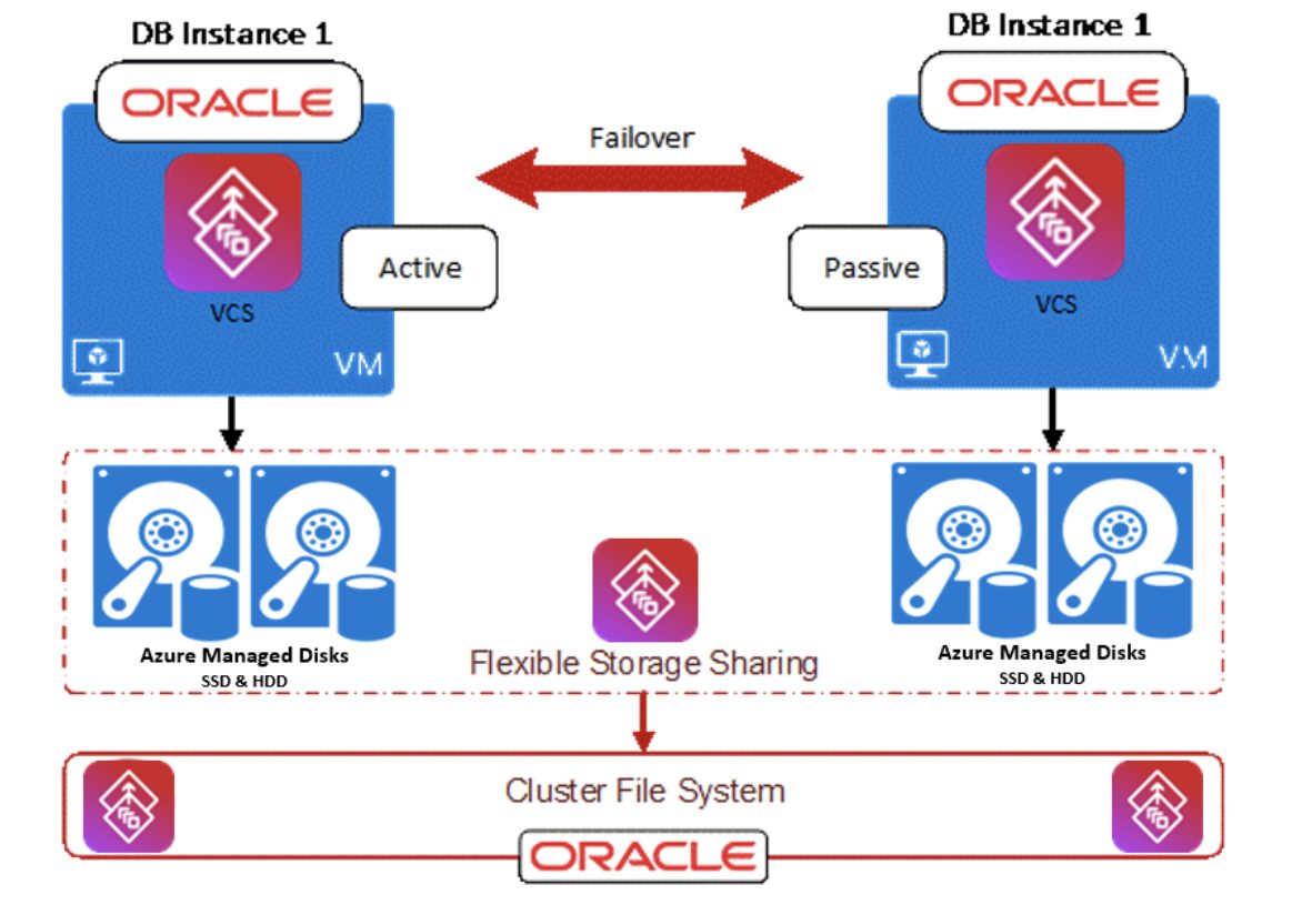 Veritas Alta Enterprise Resiliency’s Cluster File System (CFS) with Flexible Storage Sharing (FSS) is the ideal way to create a highly available Oracle single-instance solution in the cloud. Veritas Alta Enterprise Resiliency’s CFS with FSS is an enterprise shared storage solution that enables you to mount a file system on multiple cloud VM’s at the same time – which dramatically reduces failover times. FSS supports disk devices in the public cloud, which enables you to build a shared storage solution for Oracle in Amazon AWS, Microsoft Azure, and Google Cloud Platform. Figure 1 is an example of an Oracle single-instance database running in a highly available single-instance configuration in Microsoft Azure.