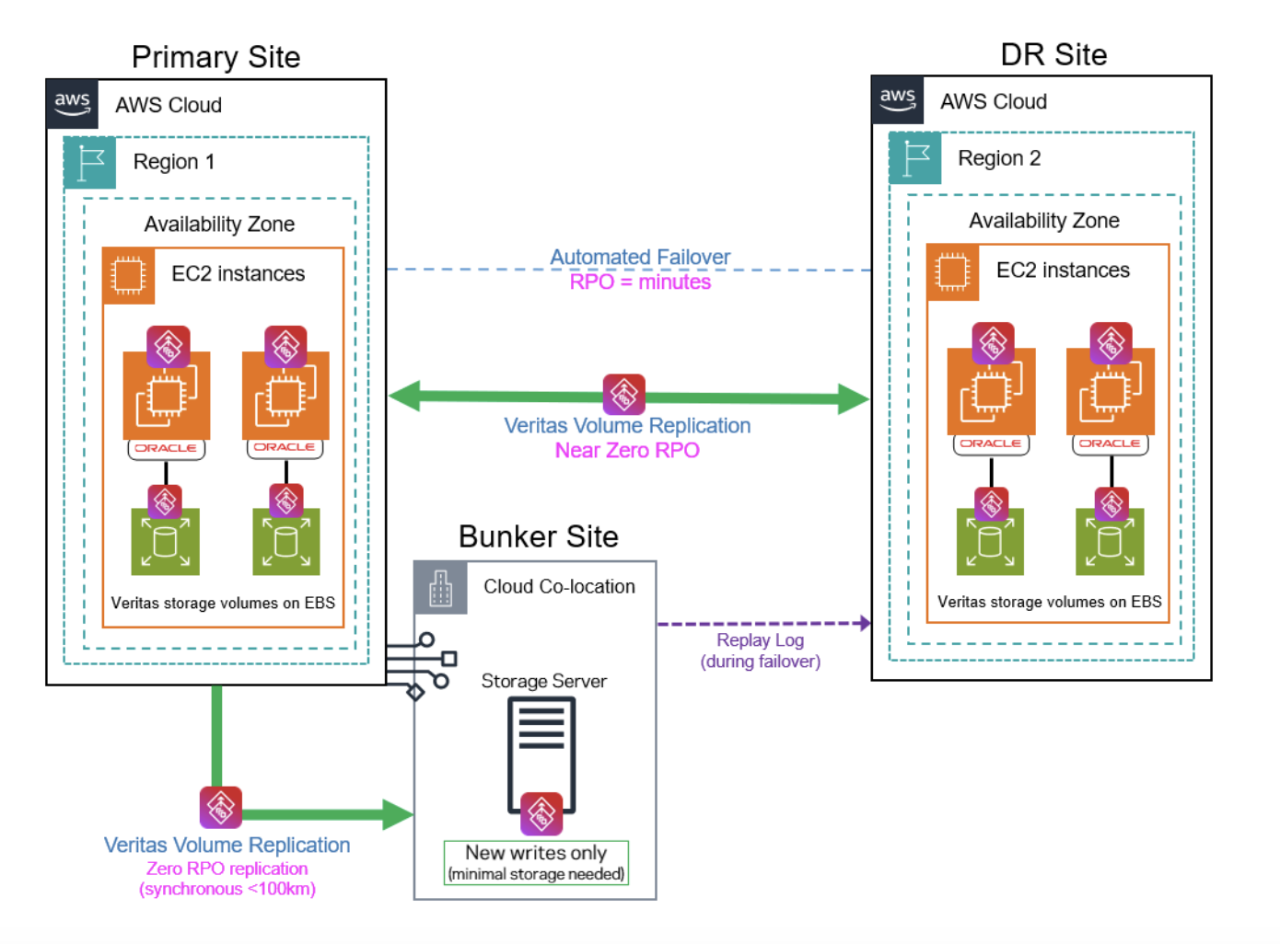Veritas Alta Enterprise Resiliency also provides a replication solution – Veritas Volume Replicator (VVR) – that enables multi-platform DR for your Oracle databases. DR can be configured between datacenters and public clouds – with zero data loss (zero RPO). An example configuration is shown in Figure 2. VVR is also a robust mechanism for moving data into public cloud environments – helping you migrate to the cloud efficiently.