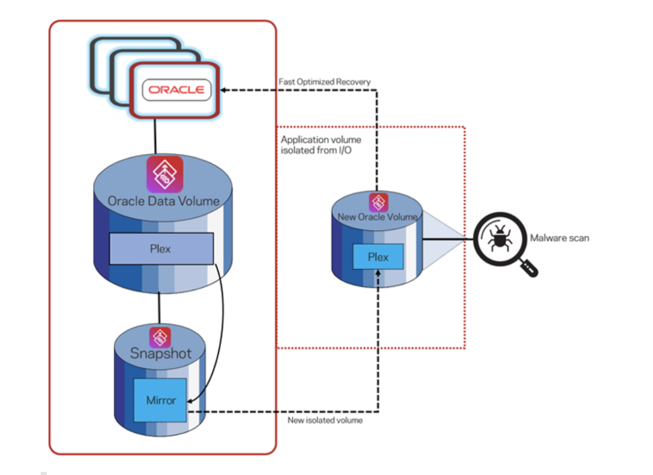 In addition to SecureFS and encryption, Veritas Alta Enterprise Resiliency enables isolation for production data by mirroring data volumes and isolating them from new I/O – which helps keep data volumes inaccessible by malware. For an additional layer of security, you can optionally use an anti-malware engine to scan these volumes to ensure they’re free of ransomware. Veritas Alta Enterprise Resiliency’s FastResync option allows you to quickly reassociate isolated volumes with the original volume in an optimized manner where only changed data is synchronized. This gives you a fast and reliable way to protect your Oracle databases from ransomware attacks with a very low RPO and RTO.