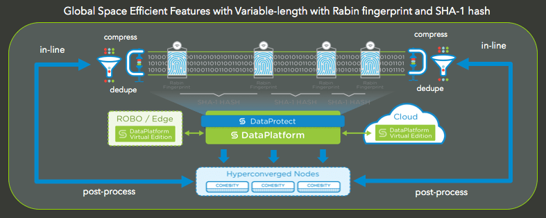 From a space-efficiency perspective, Cohesity’s DataPlatform provides global space efficiency features from global variable-length dedupe. This supports both in-line and post-process dedupe and compression.