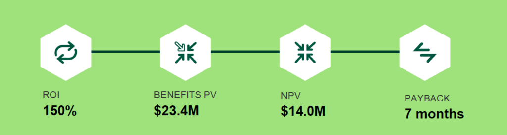 The results are in, and they’re impressive. The organizations studied realized an overall ROI of 150% in three years, with payback achieved just seven months after deployment. Total benefits present value (PV)? Approximately $23.4 million.