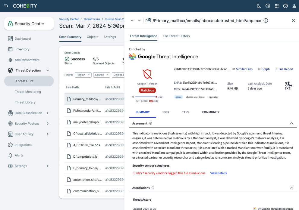 Cohesity helps thousands of organizations like Nasdaq, Ausenco, and many more to secure and protect their Microsoft 365 deployments—and we’re always innovating to help you stay ahead of bad actors. Today, we're introducing new threat scanning capabilities for Cohesity Data Cloud to detect indicators of compromise (IOCs) in OneDrive, Exchange, and SharePoint Online data.