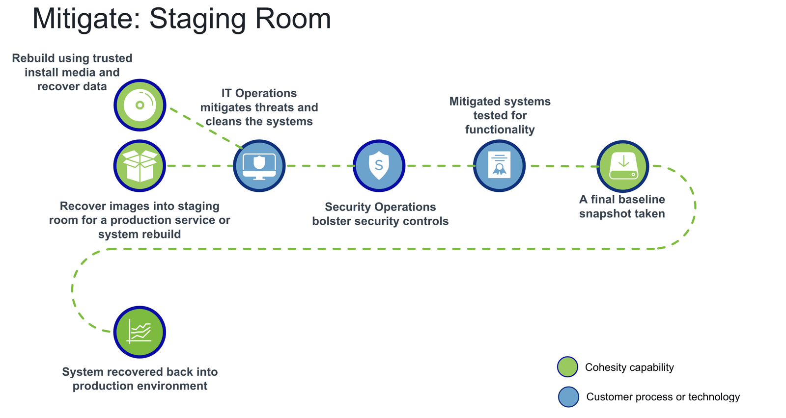 Modern threats aren’t a “one size fits all” experience. During mitigation, a decision is made to either recover and “clean” the existing system or to rebuild and restore the data. By having an isolated staging area users are able to determine their path forward.