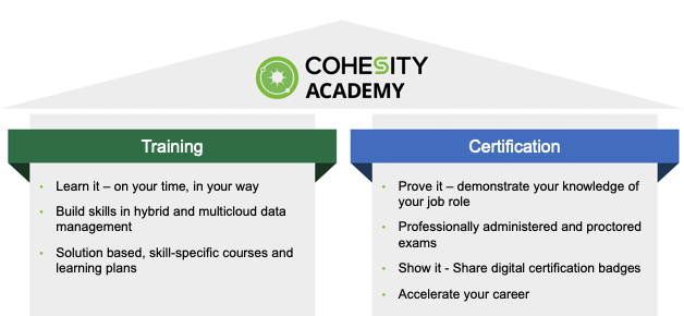 After completing rigorous coursework, Cohesity Academy provides a way for individuals to prove their data management expertise to peers and their leadership. This certification, together with six months of on the job training, is highly recommended for anyone pursuing a career in data management.