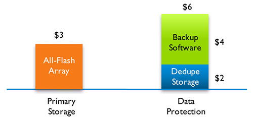 The high-level math is simple. Primary all-flash storage costs about $8-$12 / raw GB street, and after dedupe and compression comes down to $2-$3 / front-end GB street1 . Now let’s compare that to the price of data protection. Data Domain costs about $2 / front-end GB street2 . Add to that the cost of legacy backup software for another $4 / front-end GB street3 . And that’s how data protection costs more than primary all-flash storage! Just for an insurance policy that will remain unproductive 99% of the time.