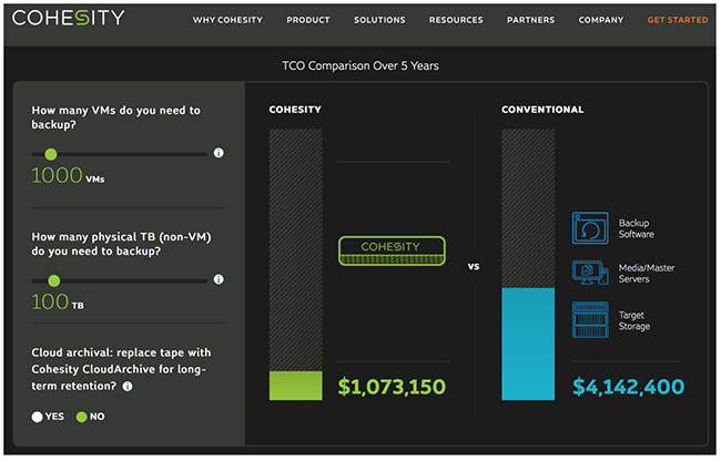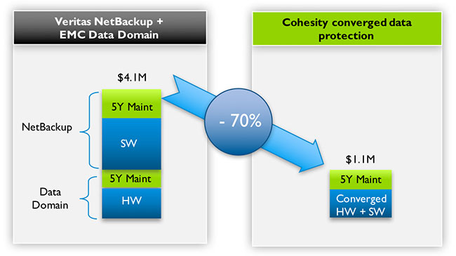 The good news is that Cohesity can have a dramatic impact on the cost of data protection. We have a unique approach to data protection with a distributed, hyperconverged platform that converges both target storage and backup. We simplify the environment by eliminating data protection silos (target storage, media servers, master servers) and providing a single point of management. But we also reduce CAPEX by replacing expensive purpose-built hardware (eg Data Domain) and backup licenses (eg Veritas NetBackup) with a single software-defined solution running on scale-out x86 systems.