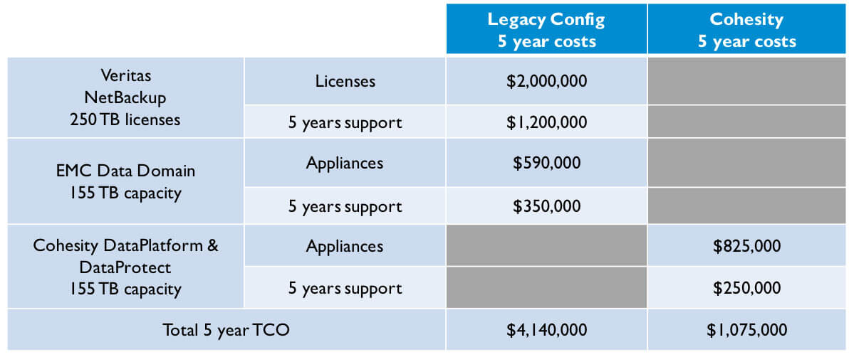 We applied these capacity requirements to two different configurations. The legacy approach consists of EMC Data Domain dedupe storage and Veritas NetBackup software. In the Cohesity scenario, we replace both with Cohesity DataPlatform and DataProtect. All costs are based on list prices for simplicity (given that discounts and net prices will vary by customer).