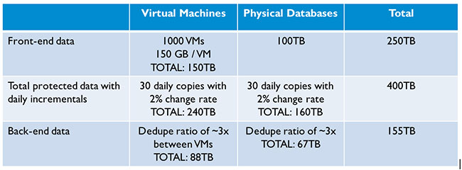 This leads to a total of 250TB of production data (front-end), consuming about 155TB of dedupe storage capacity (back-end). The table below details the capacity requirements.