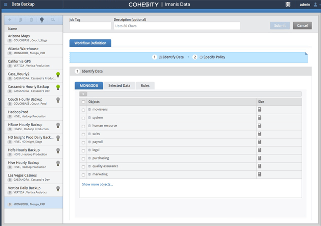 Hadoop HDFS and NoSQL distributed databases – Cohesity Imanis Data offers comprehensive and integrated protection with a single software-defined solution for Hadoop and NoSQL distributed databases. The solution offers unlimited scalability and data management capabilities only previously available for transactional databases.