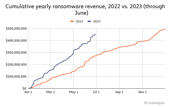Chainalysis Report – Cumulative yearly ransomware revenue, 2022 vs. 2023 (through June)