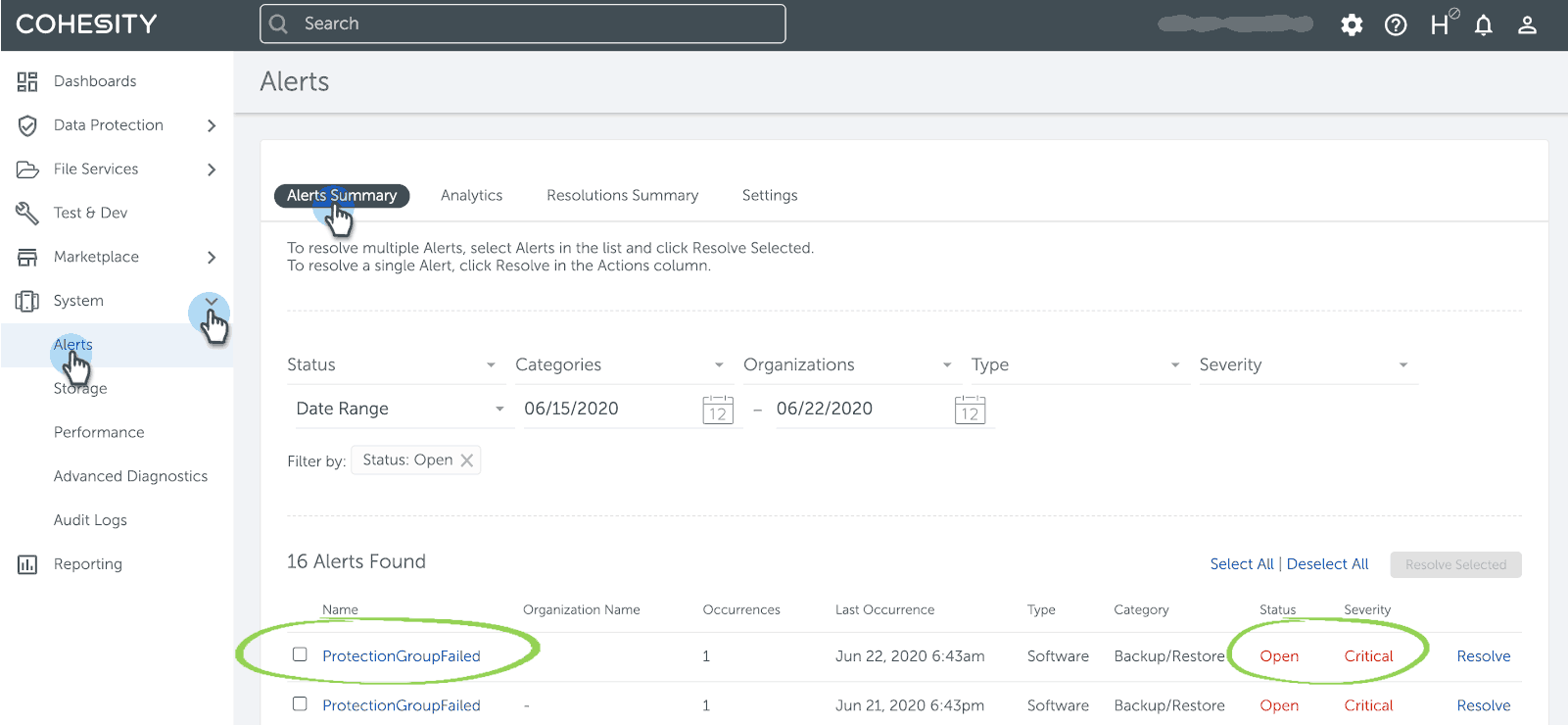 Figure 3: Cohesity Alerts in Cohesity DataPlatform