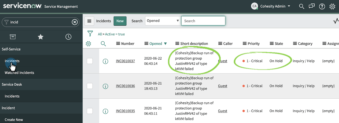 Once you complete this configuration, any Alerts that are raised on your Cohesity cluster are immediately raised on ServiceNow as Incidents.