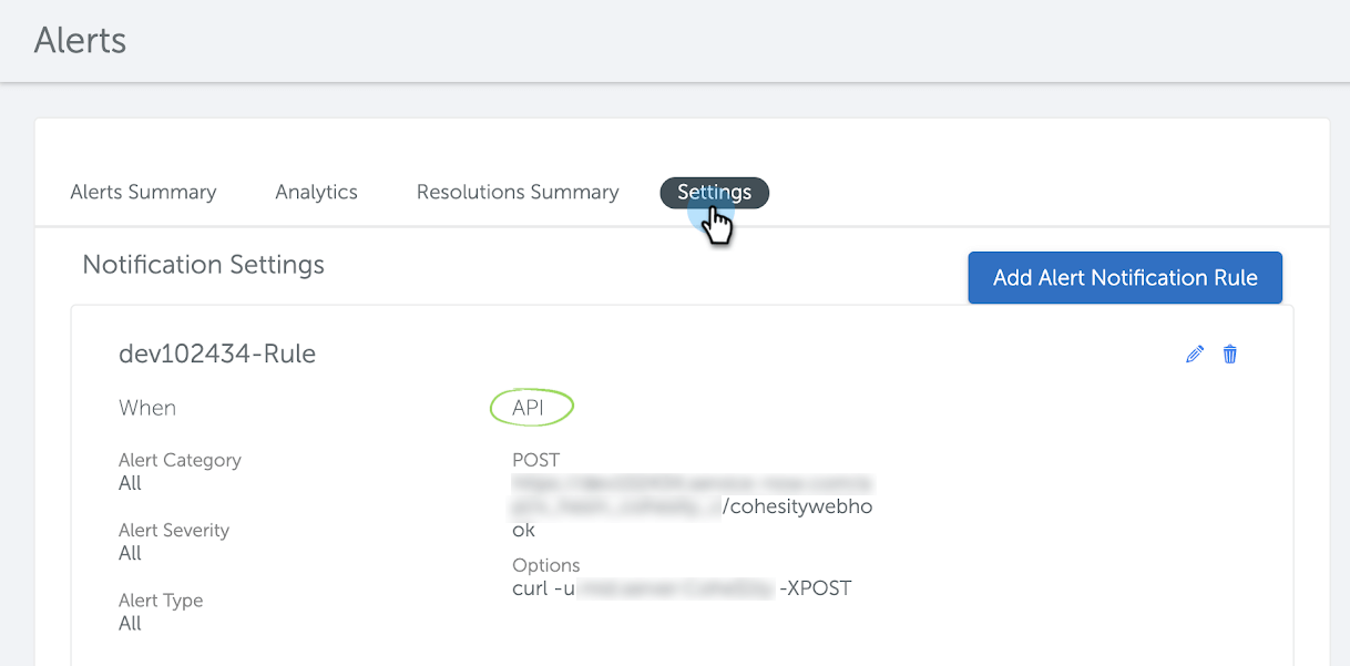 Figure 2: Cohesity DataPlatform Configured for ServiceNow Webhook