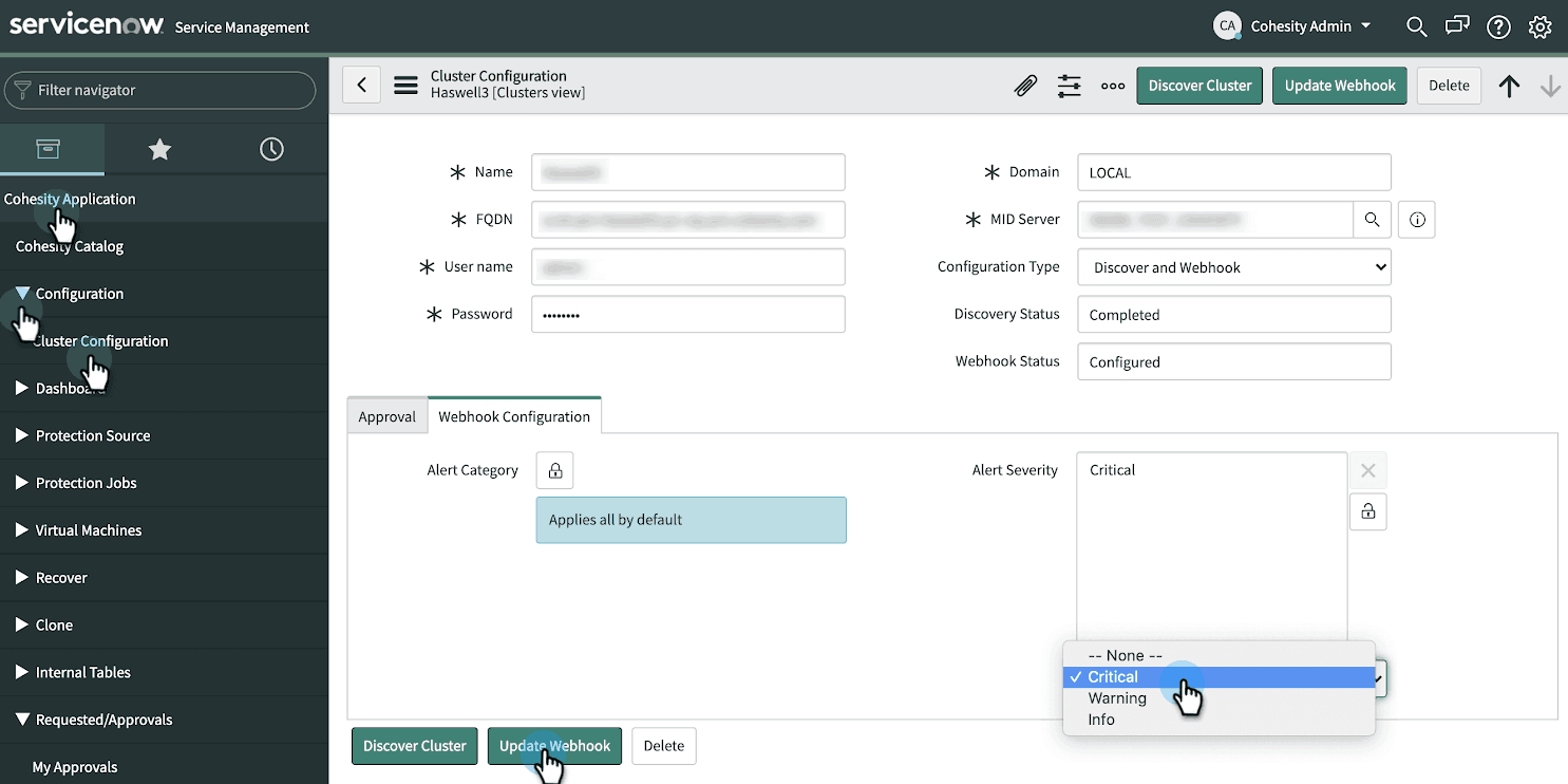 When you configure your Cohesity cluster on ServiceNow, you can choose to set up a webhook (among other options). You can also select which Cohesity Alert types (Info, Warning, and/or Critical) you want to see on ServiceNow.