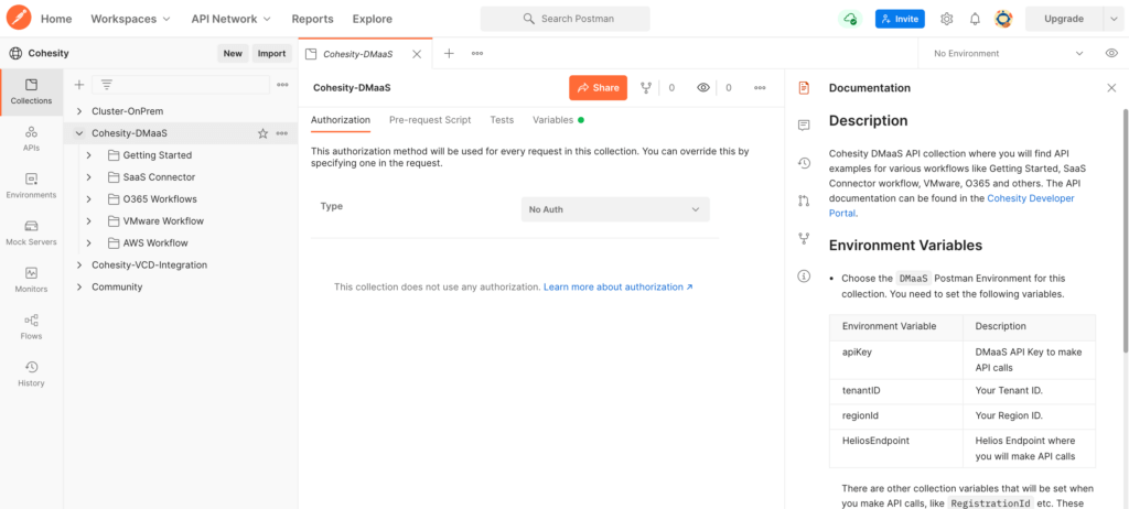 The Cohesity workspace on Postman includes collections that cover a wide range of workflows with sample request body and saved responses wherever possible. All of these workflows also have clear documentation explaining how the APIs are used. These collections are not merely API documentation but are full-fledged workflows with all the API calls in sequence that you may need to perform this workflow.