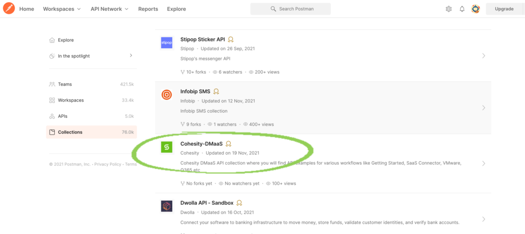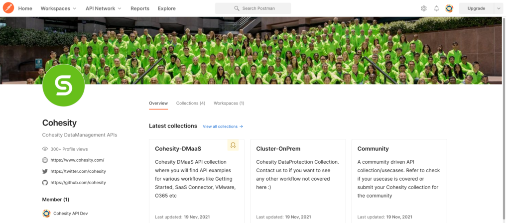 To improve the Cohesity developer experience, we have introduced Cohesity Postman Public Workspace. This workspace hosts many Cohesity workflows in the form of Postman Collections, which are a tidy way to group your requests together so you can save, reuse, and share them with others.