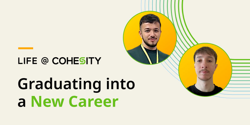 At Cohesity, we’re dedicated to investing in the next generation of talent. We’re always interested in welcoming recent graduates (or those almost there) into our fold. Recently, our Cork, Ireland office brought on two local students, Mert Halici and Evan Dunbar, to help them kickstart their careers, and develop their already astounding talents. We decided to sit down with Mert and Evan to talk about their experiences, and what getting started with Cohesity has meant for them as they set out on their tech journeys.