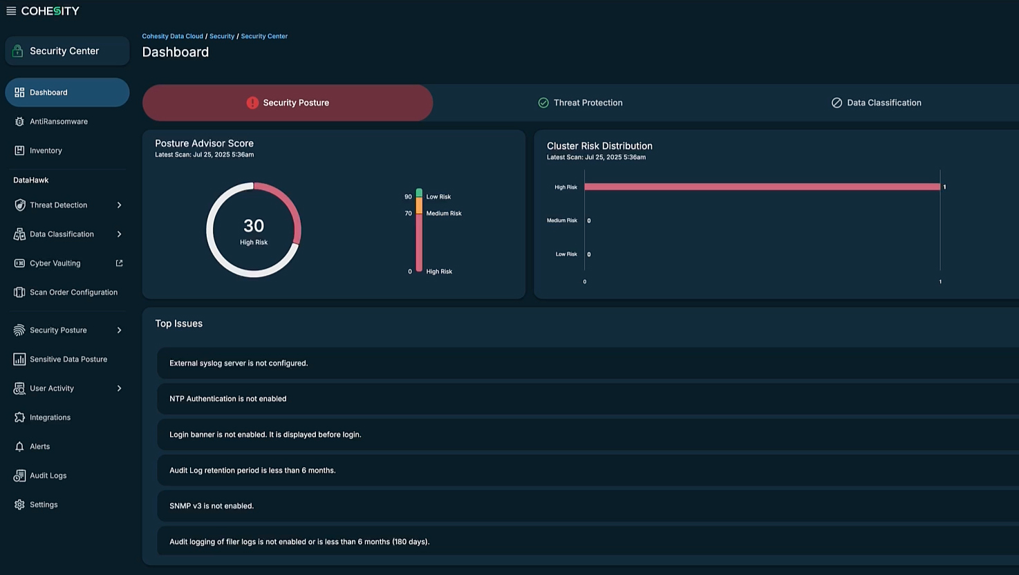 Gain continuous visibility into sensitive data with Cyera’s AI-powered DSPM, then adjust protection policies in Cohesity Data Cloud to improve cyber resilience.